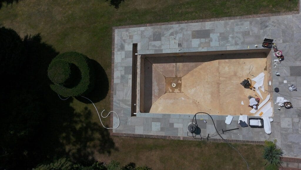 The design brief was to bring the pool up to date with new coping stones, all new wall fittings such as skimmers and return inlets, as well as new pipework from the pool back to the plant room.