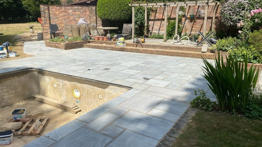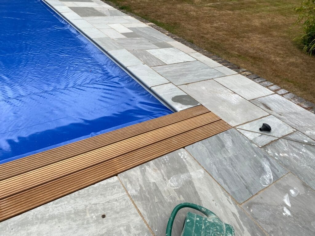 DP Pool services also got the job to fully re-landscape the pool area which was carried out using Indian sandstone supplied by our longstanding coping stone and paving supplier Cranbourne Stone.